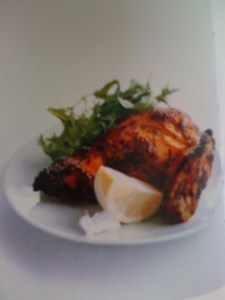 Preheat the oven to 200C (400F). Make deep slits all over the chicken pieces. Blend together the corn starch, yoghurt, harissa, mint, cumin. pepper and salt. Spread the yoghurt mixture all over both sides of the chicken. Place the chicken on a rack in a baking dish. Bake for 25-35 minutes or until the chicken is crisp and golden. Serve warm or cold with a green salad and a squeeze of lemon. Serves 4. (in my case 2)
