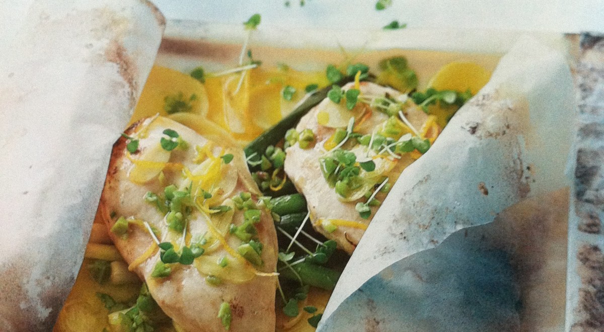 Layer 2 x 30cm x 40cm pieces of non-stick baking paper on a tray and fold 3 edges in to form an envelope, leaving 1 edge open. Place the potato, leek, chicken and butter in the parcel and fold the remaining edge to enclose. Bake for 30-35 minutes or until the chicken is cooked through. Carefully open the parcels and top with the dressing and baby basil leaves to serve.