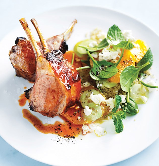 Preheat oven to 220°C (425°F). Mix to combine the harissa, honey, orange rind, half the oil, salt and pepper and brush over the lamb. Place on a large baking tray lined with non-stick baking paper and roast for 20 minutes for medium rare or until cooked to your liking. Place the quinoa, cucumber, orange, spinach, mint, feta, remaining oil, lemon juice, salt and pepper in a bowl and toss to combine. Slice the lamb and serve with the salad. Serves 4.
