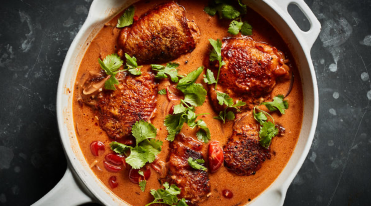 - Add the tomatoes with their juices and the coconut milk, and stir until combined, scraping up any brown bits that have formed at the bottom of the pan. Nestle the chicken back into the skillet along with any juices that have accumulated. Simmer, uncovered, until the chicken is cooked through and the sauce has thickened slightly, 15 to 20 minutes. Season to taste with salt and pepper.